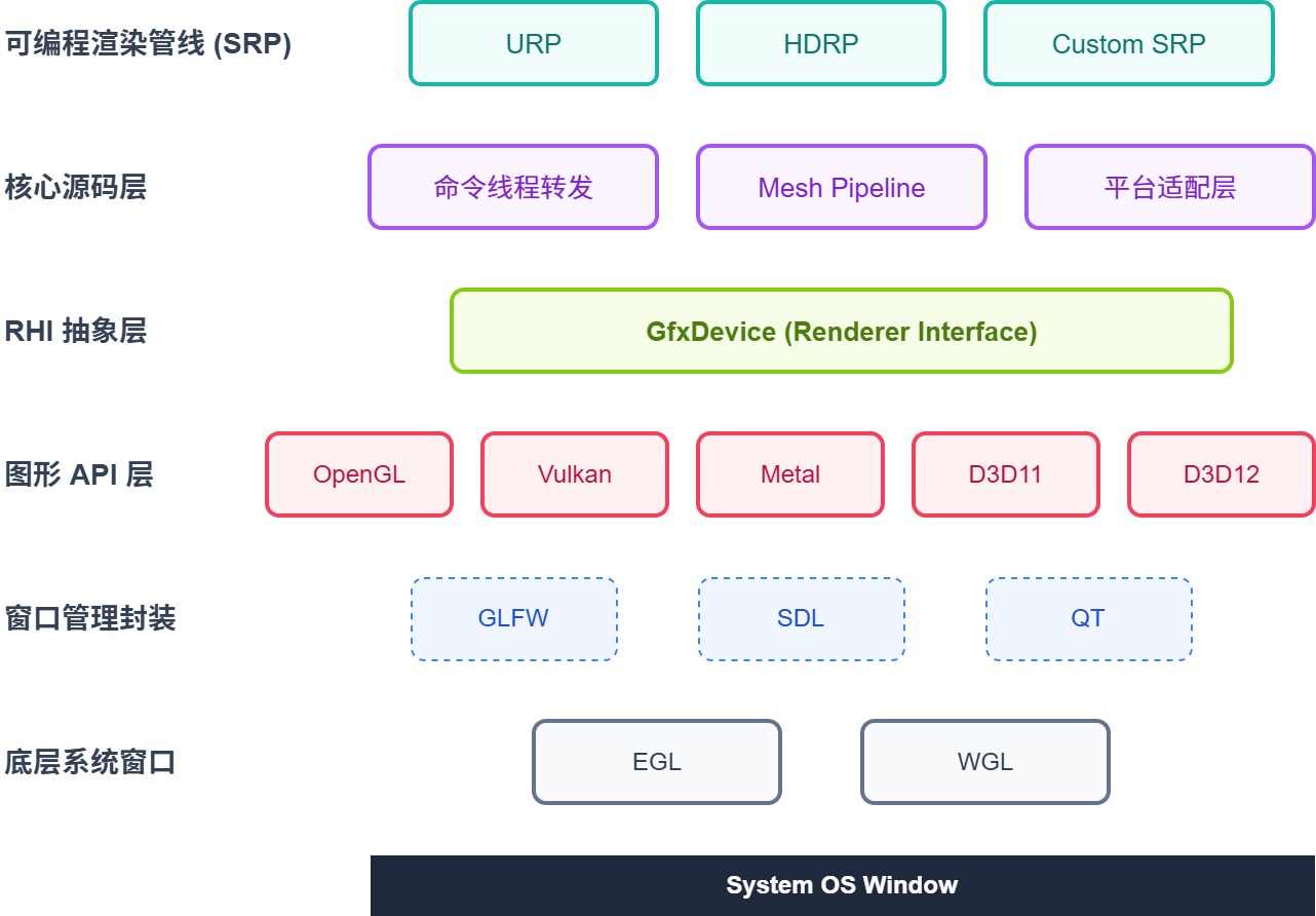 Unity 引擎的渲染架构采用了典型的分层设计,从底层操作系统到上层 C# 脚本层层封装,以实现跨平台兼容和逻辑解耦。