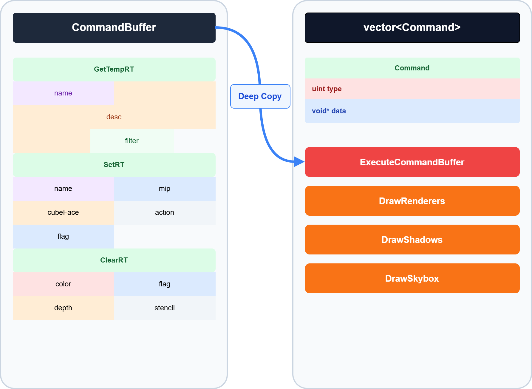 context.ExecuteCommandBuffer(cmd)的作用是将 CommandBuffer 中的命令列表 复制 到 Context 的执行队列中。- 重要细节: